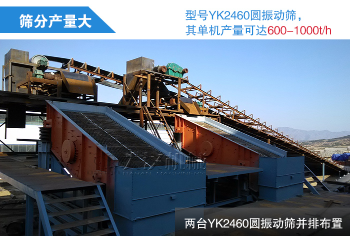 型號YK2460圓振動篩,其單機產量可達600-1000t/h,在時產2000噸的鐵礦石生產線中,兩臺YK2460圓振動篩并排布置,便可輕松達到生產線篩分產量要求,篩分產量是非??捎^的。